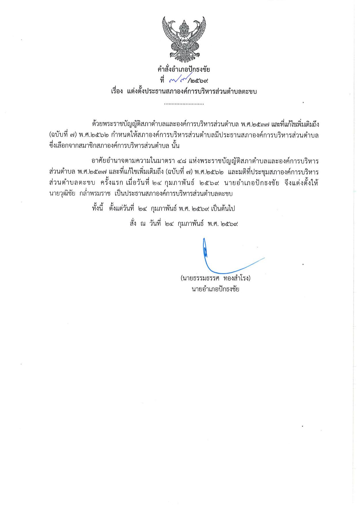 คำสั่งอำเภอปักธงชัย เรื่อง แต่งตั้งประธานสภาองค์การบริหารส่วนตำบลตะขบ |
